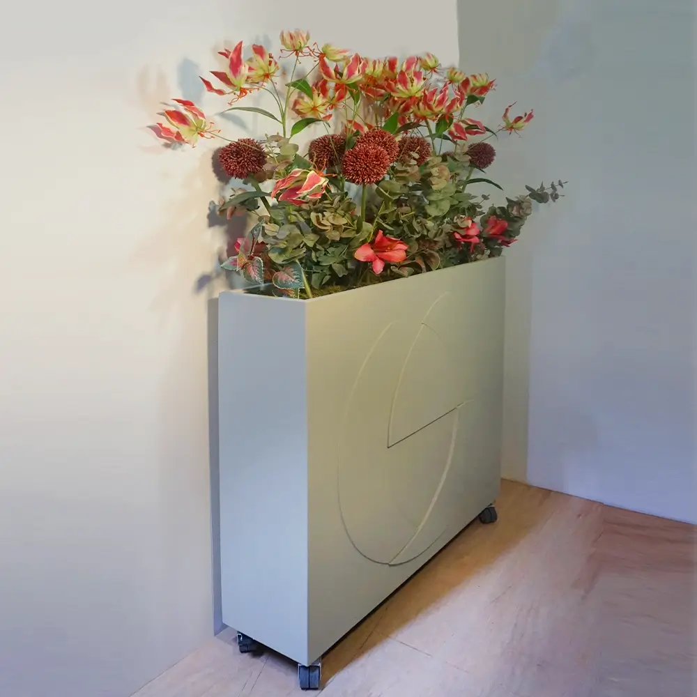 Durch die Rollen an der Unterseite eignet sich dieser Pflanzkasten praktisch als Raumteiler zur Unterteilung und Abschirmung von Büros und anderen Räumen.